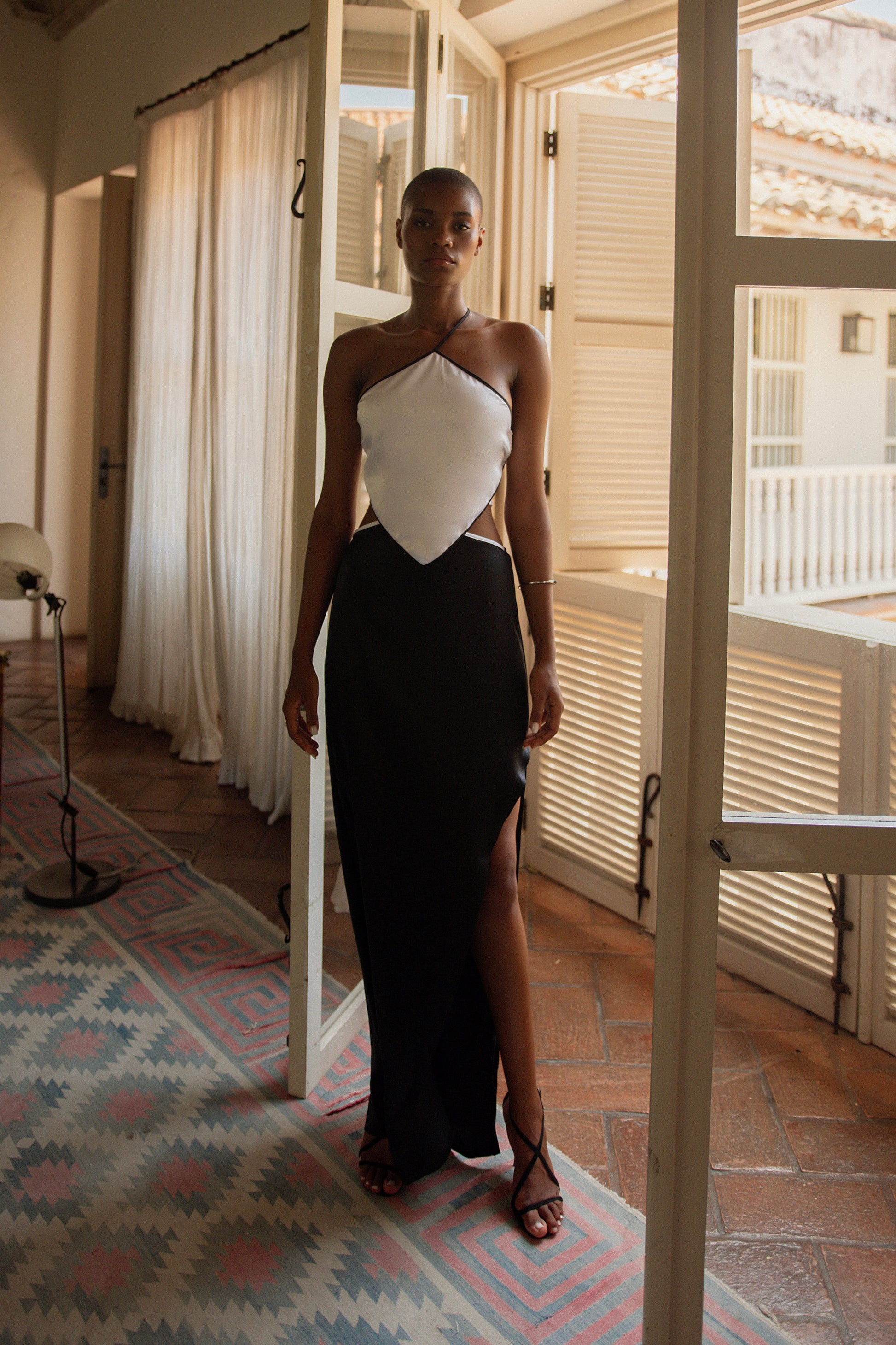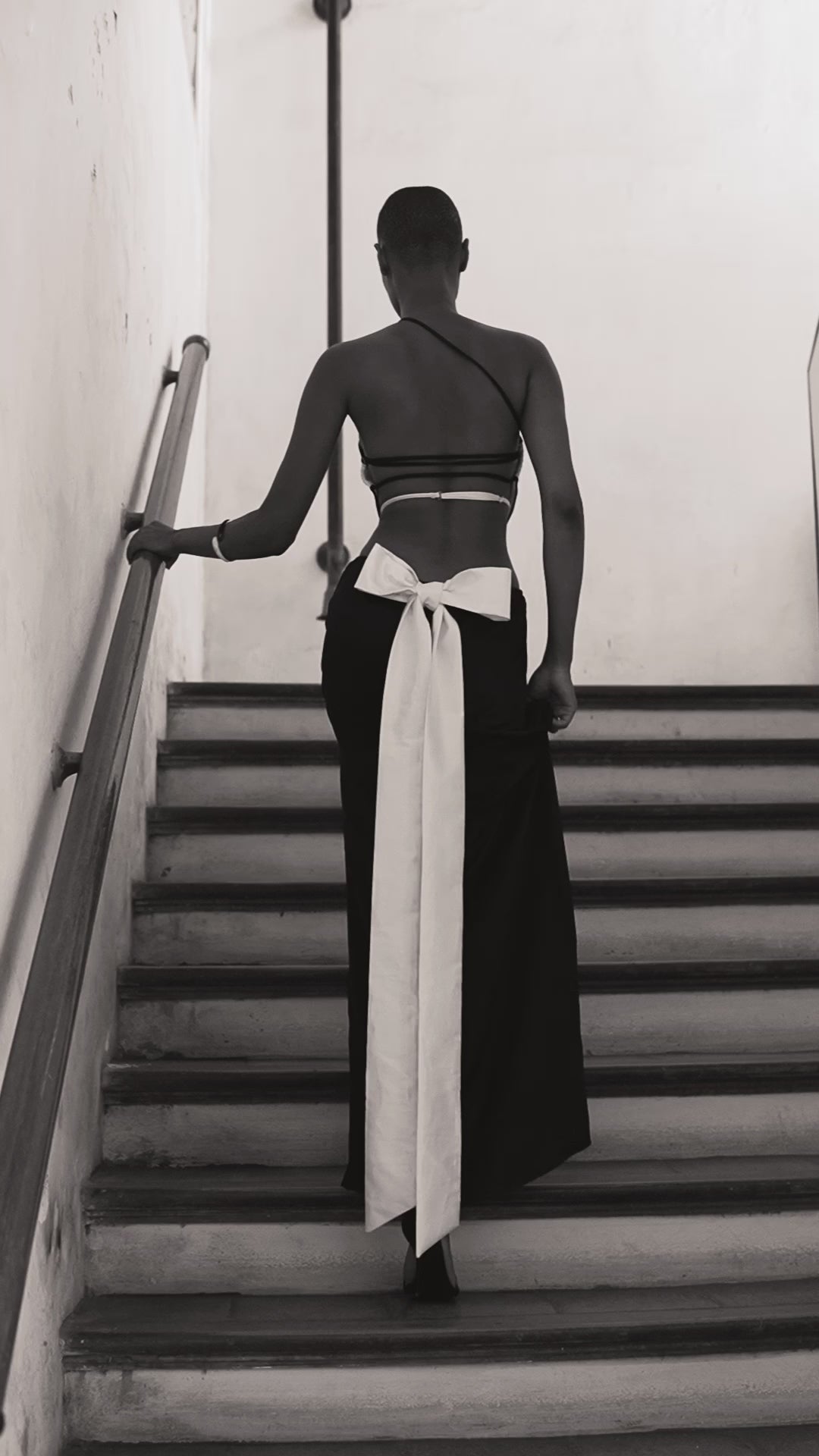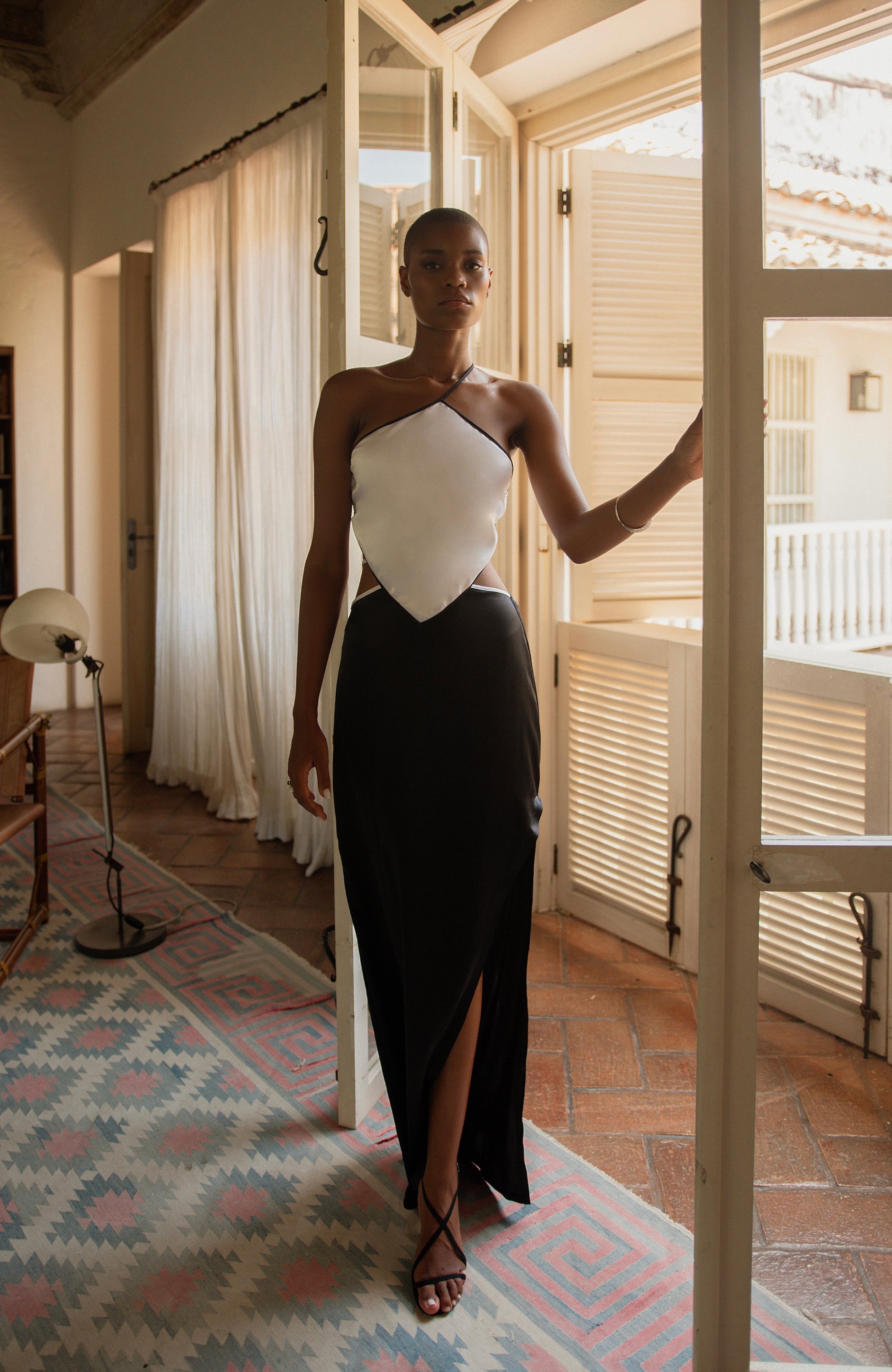 This romantic silk gown, characterized by its geometric silhouettes and refined contrasting elements, brings a unique twist to your wardrobe. It's not just a gown but also a versatile fashion piece. Wear it as a complete dress to make a striking statement,or mix and match the top and skirt separately for a chic and flexible ensemble.