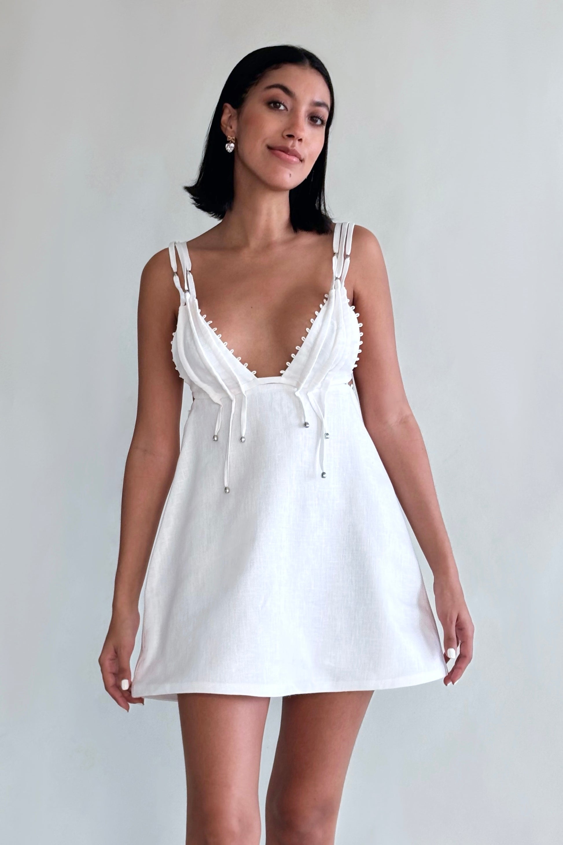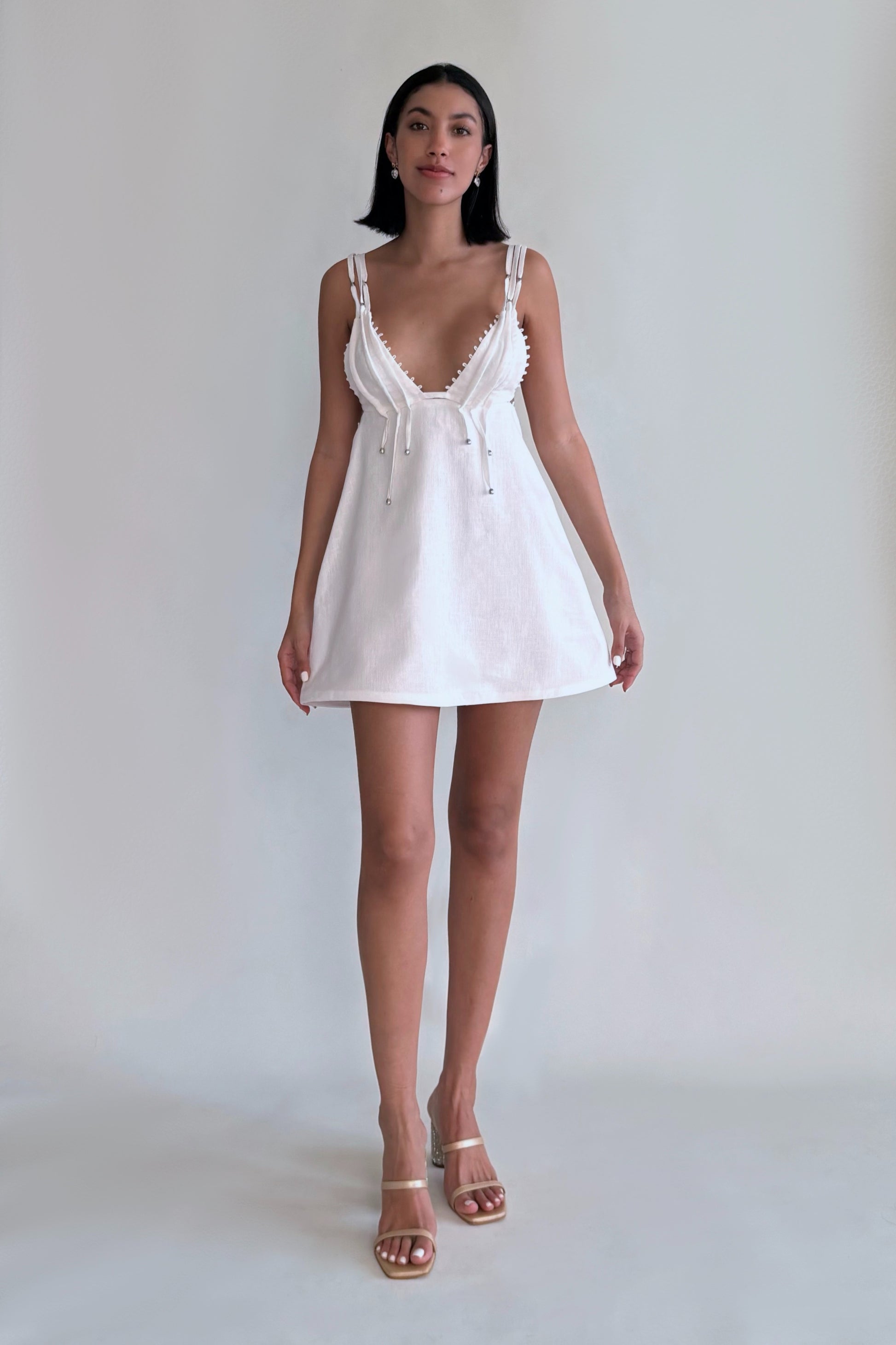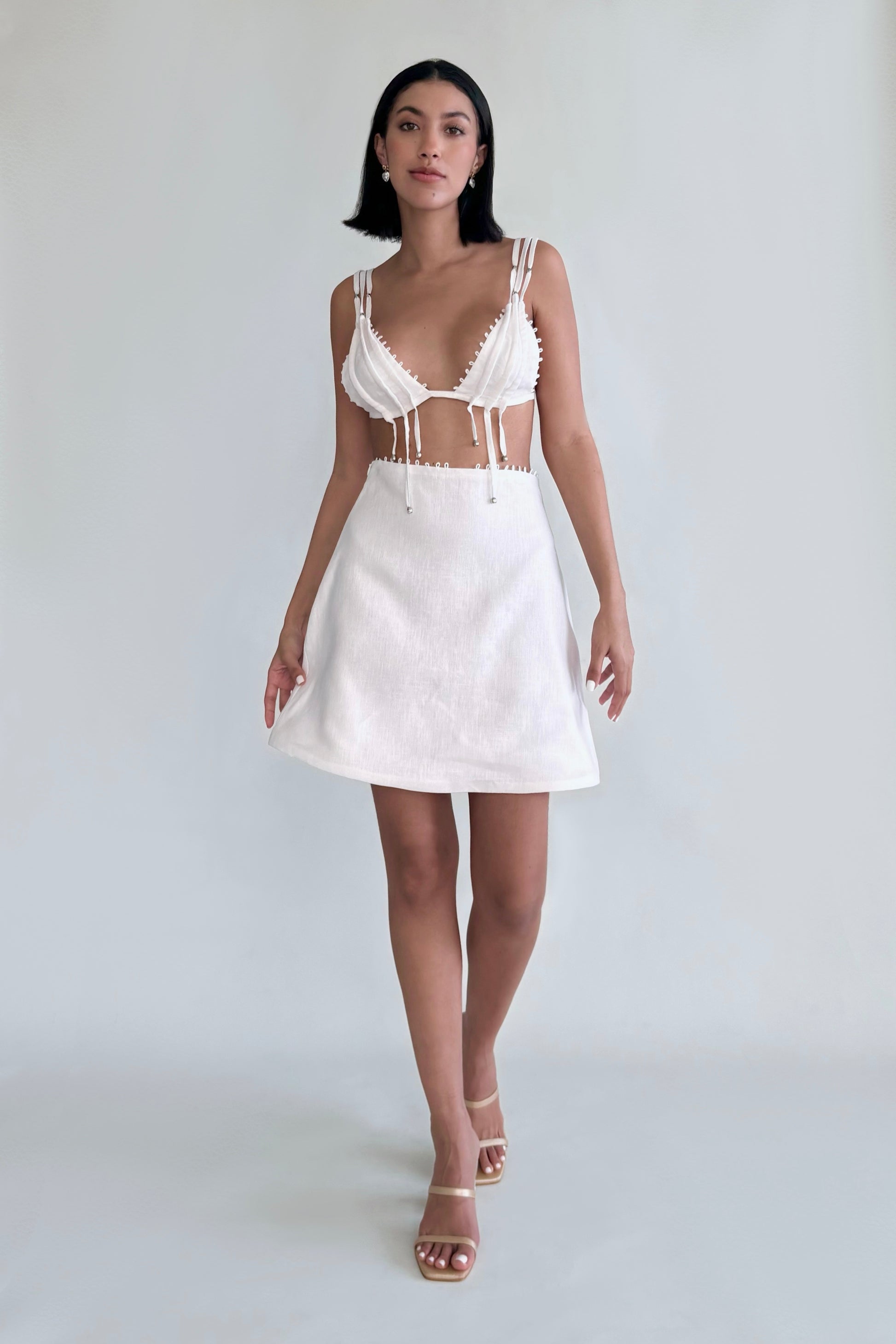 This garment is a 100% linen dress designed to be versatile and adaptable. The dress can be transformed using 100% natural mother-of-pearl buttons, allowing it to become a set of a top and skirt. This provides the flexibility to wear it as a complete dress or to mix and match the two pieces separately with other items in your wardrobe. The top features decorative details on the edges and tunnels that add a distinctive touch, with three decorative strips inside these tunnels, highlighting its unique and elegant style.