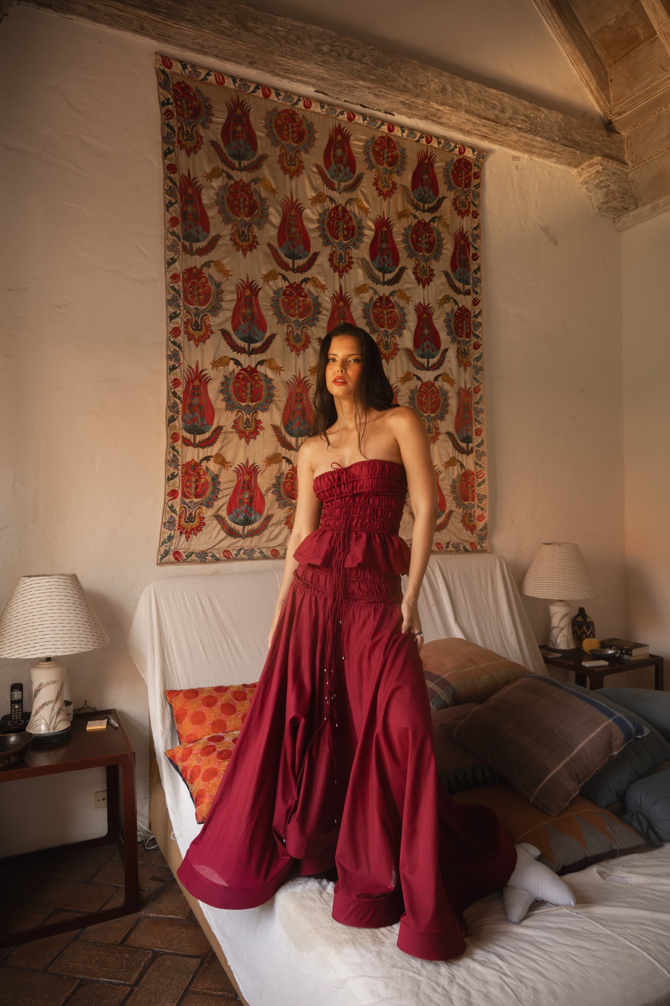 Inspired by the freedom and versatility of the modern woman, this multifaceted design piece is conceived as a canvas of inexhaustible style. Crafted from the purest cotton, its dynamic silhouette adapts to the figure thanks to our signature ruffle tunnels with elastic and delicate adjustable ties, allowing it to be worn in multiple ways: as a dress, a high-waisted skirt under the bust, at the natural waist, or as a low-rise skirt. It is a garment that transcends simple functionality to become a statement of elegance in motion, inviting you to explore femininity with audacity and comfort in every step.