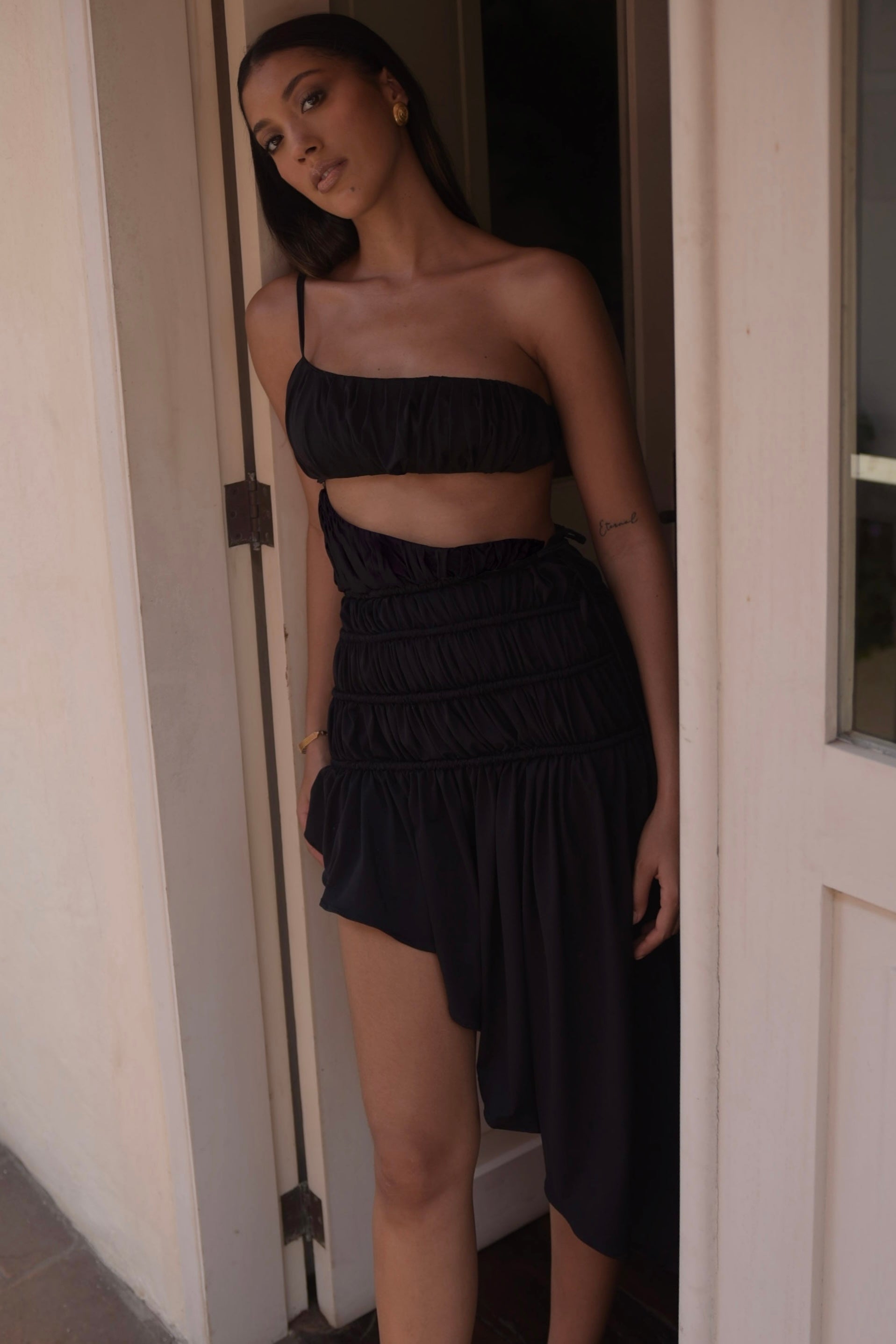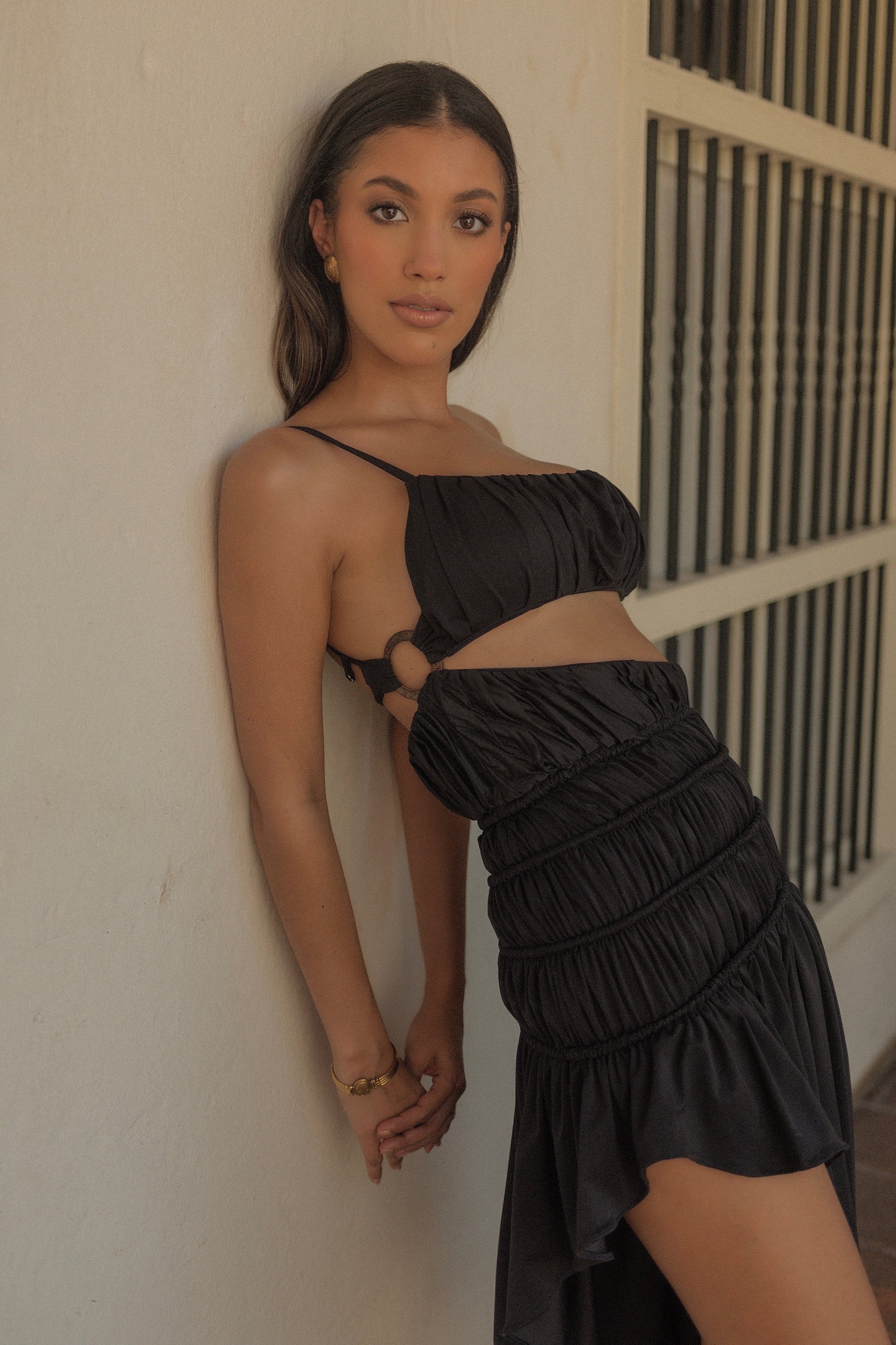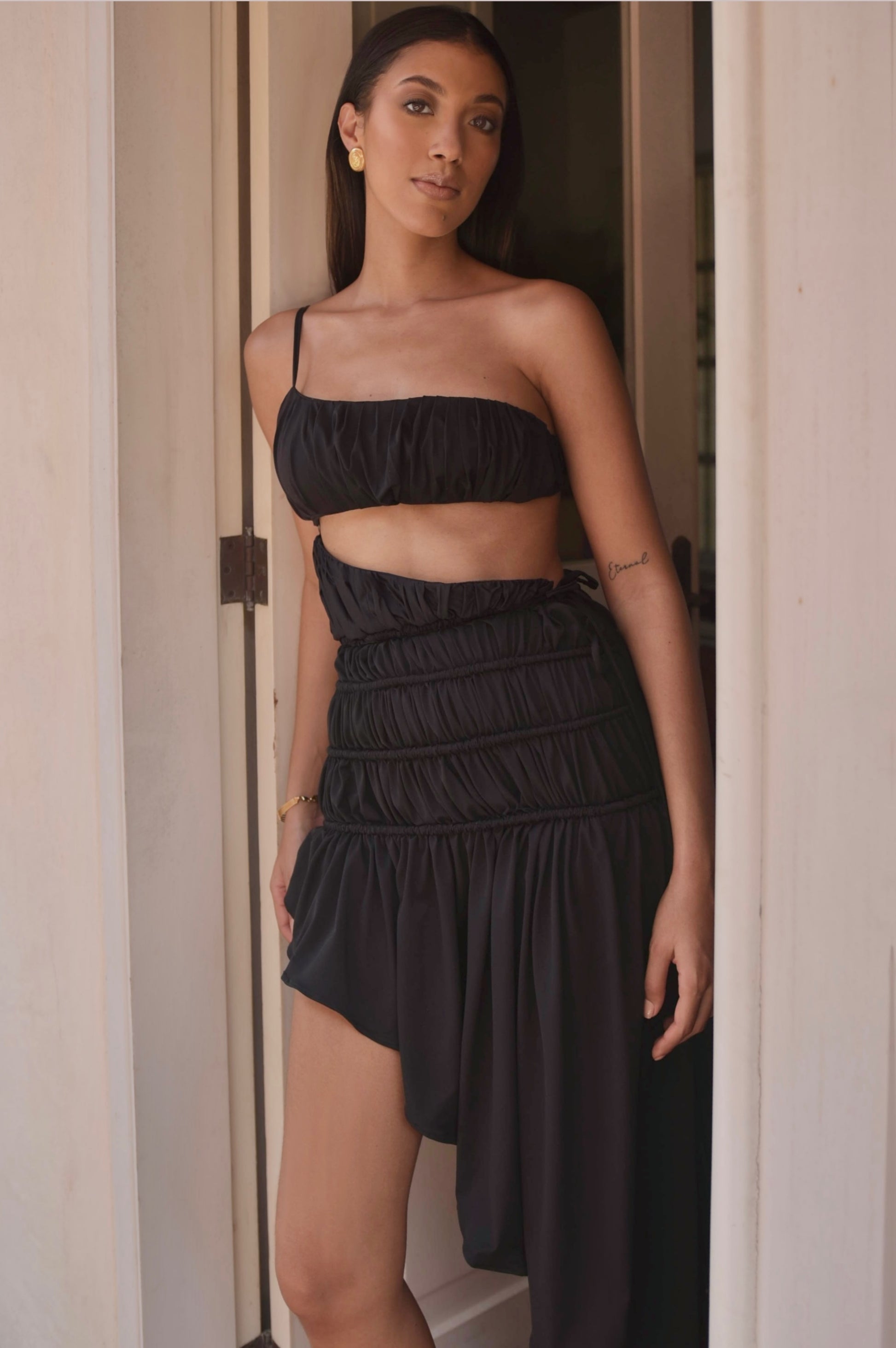This garment was crafted from upcycled polyester, highlights the changing patterns of the tides through textile transformation, evóquing texture and geometric silhouettes. You can wear complete as dress or separate